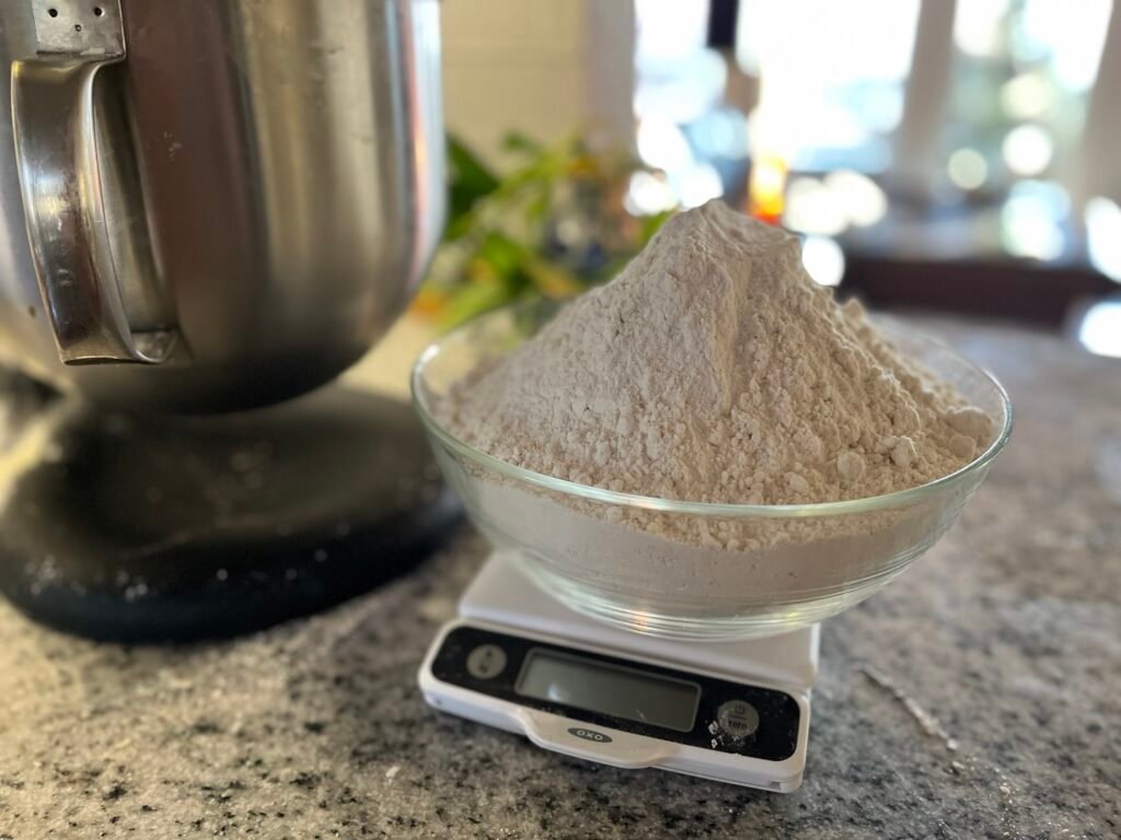 Into another bowl on my kitchen scale, I measure 40 grams of sea salt (I do this first because it’s easier to correct a mistake of adding too much), and 1,400 grams of flour. I generally use organic all-purpose flour that I buy at Costco, but any all-purpose flour will work. Anja encourages experimentation with other grains for part of the flour; I’ve tried einkorn and rye on separate occasions, and the flavor each one added to the loaves was delicious. (At this point of adding flour to the bowl, I also add flour to my starter jar, give it a vigorous stir, and when the consistency is like thick pancake batter, put it back into the refrigerator. Feeding done.)