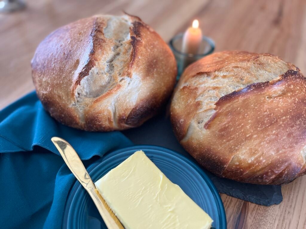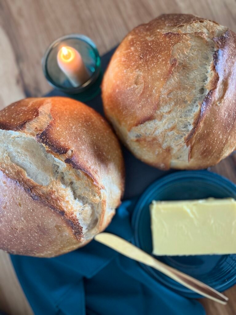 I bake two loaves at a time, which requires two Dutch ovens. If you only prepare one loaf at a time, you’ll need to cut down the baking time.